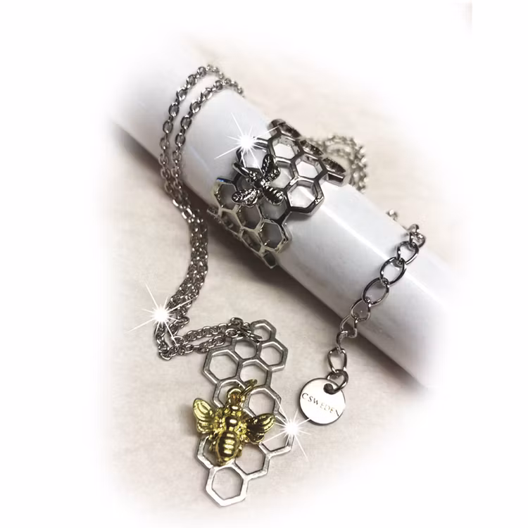 Vackert och unikt halsband i silverfärgad kedja och hexagonmönster med guldfärgat bi.