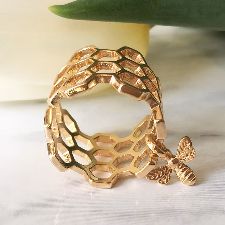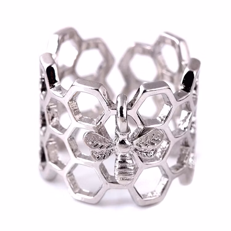 En bred vacker ring i form av hexagonmönster. Ett mönster som med sin symmetri och perfektion passar perfekt att bära som ring. Ringen pryds av ett hängande bi.