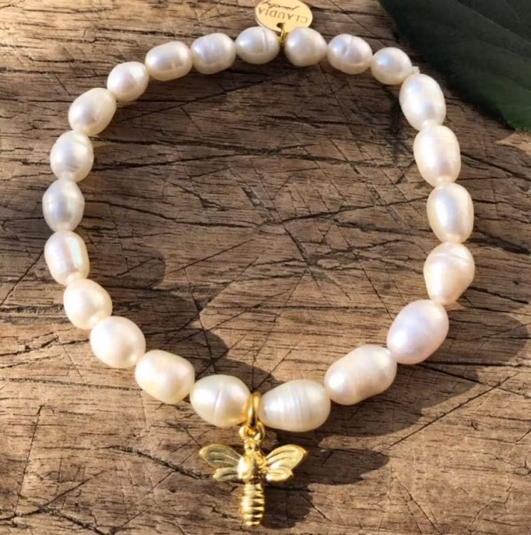 Klassiskt vackert och handgjort armband med sötvattenpärlor och ett sött guldfärgat bi som pryder länken. Smycket har odlade pärlor och kan skilja sig i färg och form.